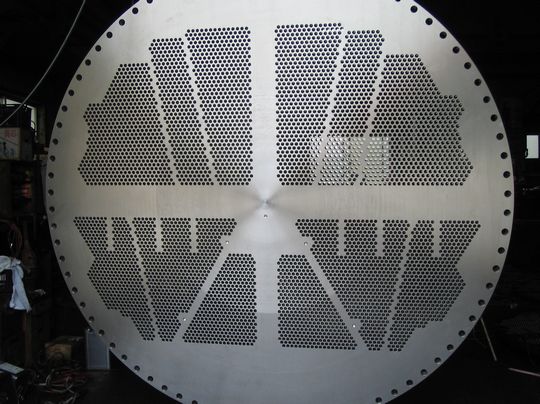 バイオ燃料精製プラントの管板です。材質SUS304、大きさはt50×φ820です。複雑な形状の穴が1枚に276ヶ所あります。大変難しい加工ですが、いい製品ができあがりました。